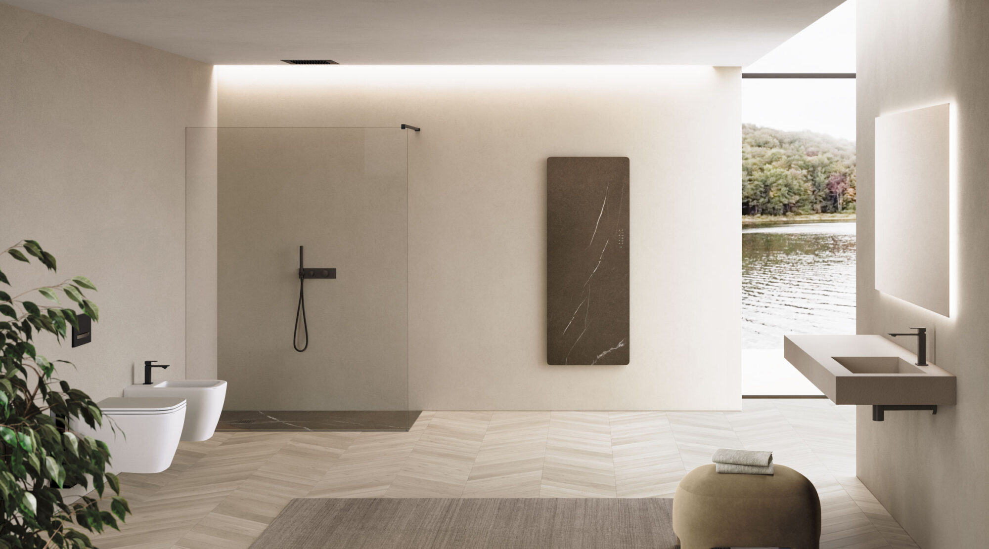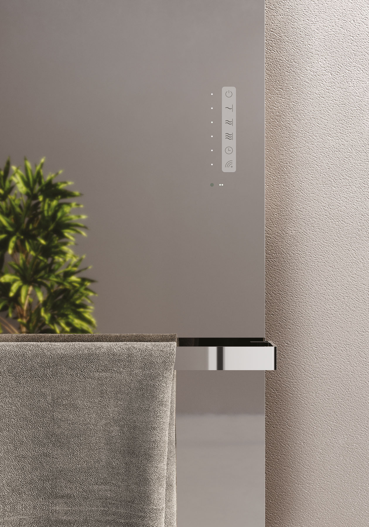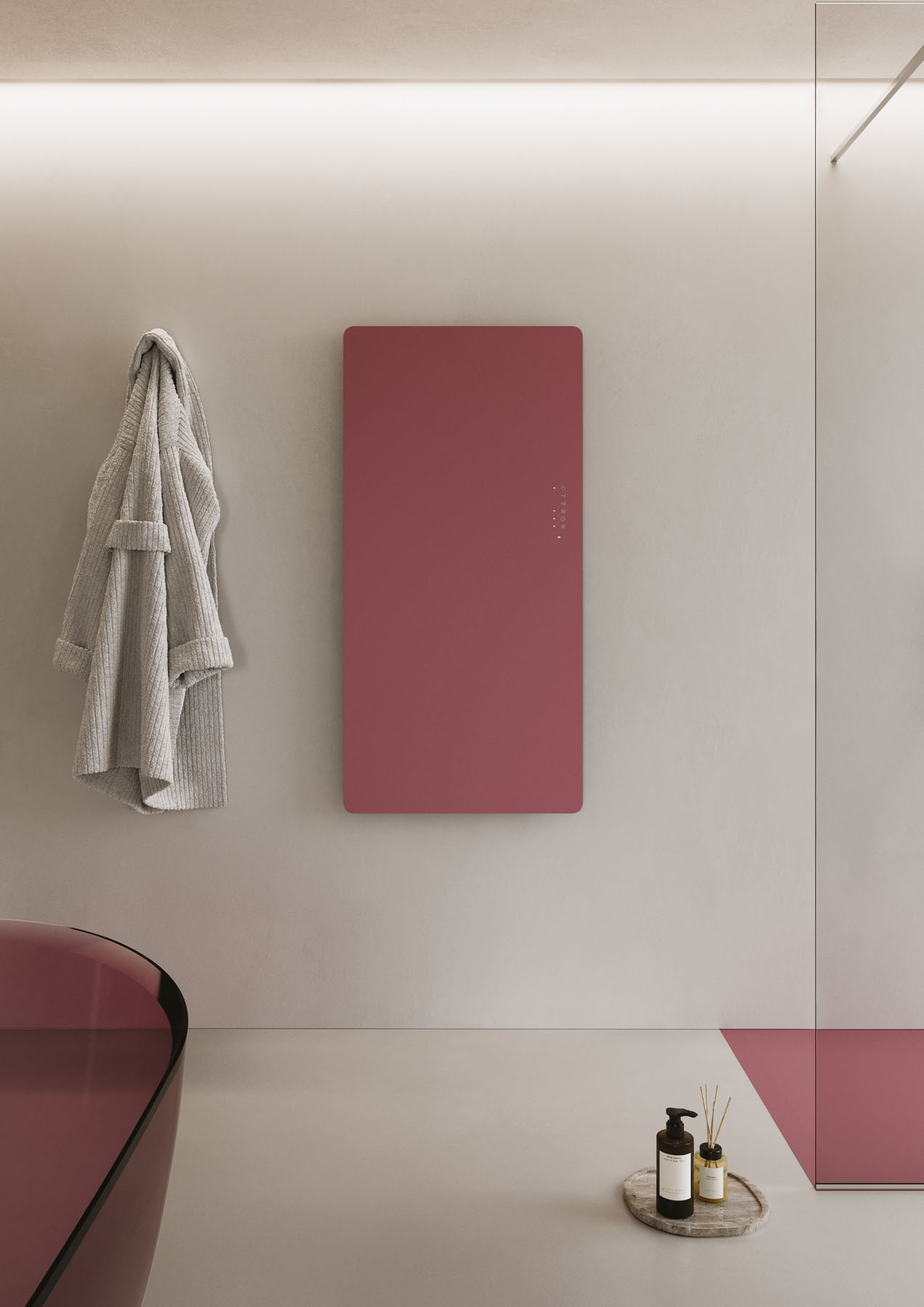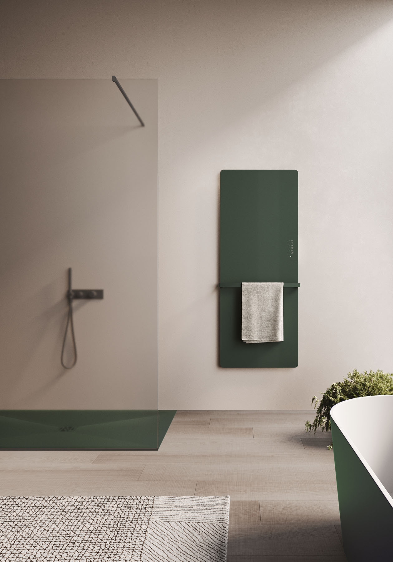 To complement the bathroom décor, the Helios electric radiator comes in a variety of colours and materials, including Aquagel and Aquatek Light, frosted glass (Bianco, Nero, coloured or in a Metal Color), and in a mirror finish. It is also available in a choice of Laminam Stoneware options to match the Blade shower tray, wall cladding and vanity tops with integrated washbasin, or cabinet fronts from the Dogma collection in the same material. It also comes in Tecnogel in a range of colours, with the same textured finish as the Nolita shower tray (warp and weft effect), or with the same finish as the Piano, Dual, Luna, Krus and Catino shower trays.