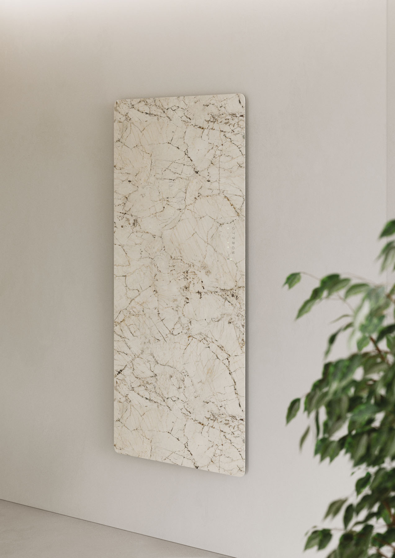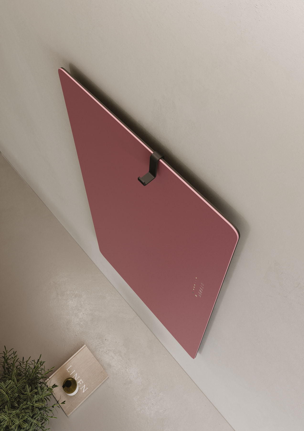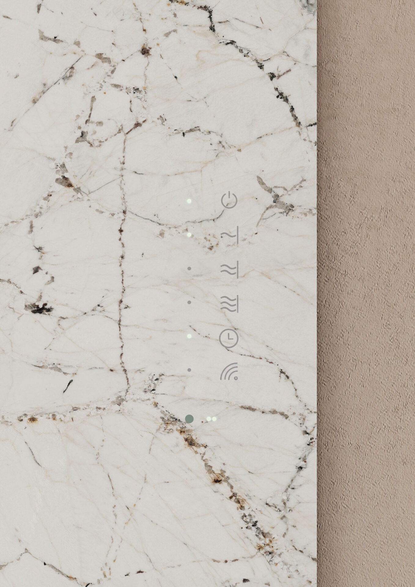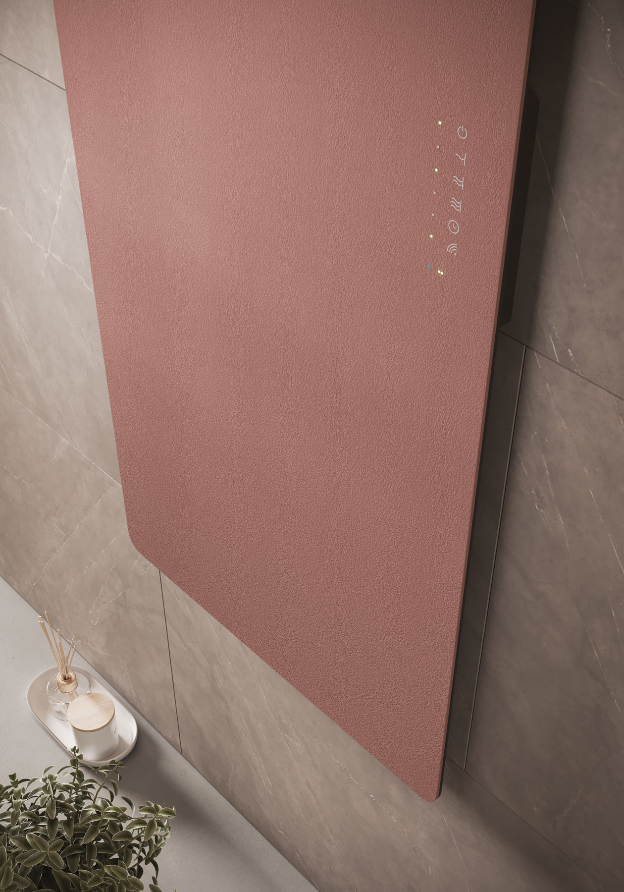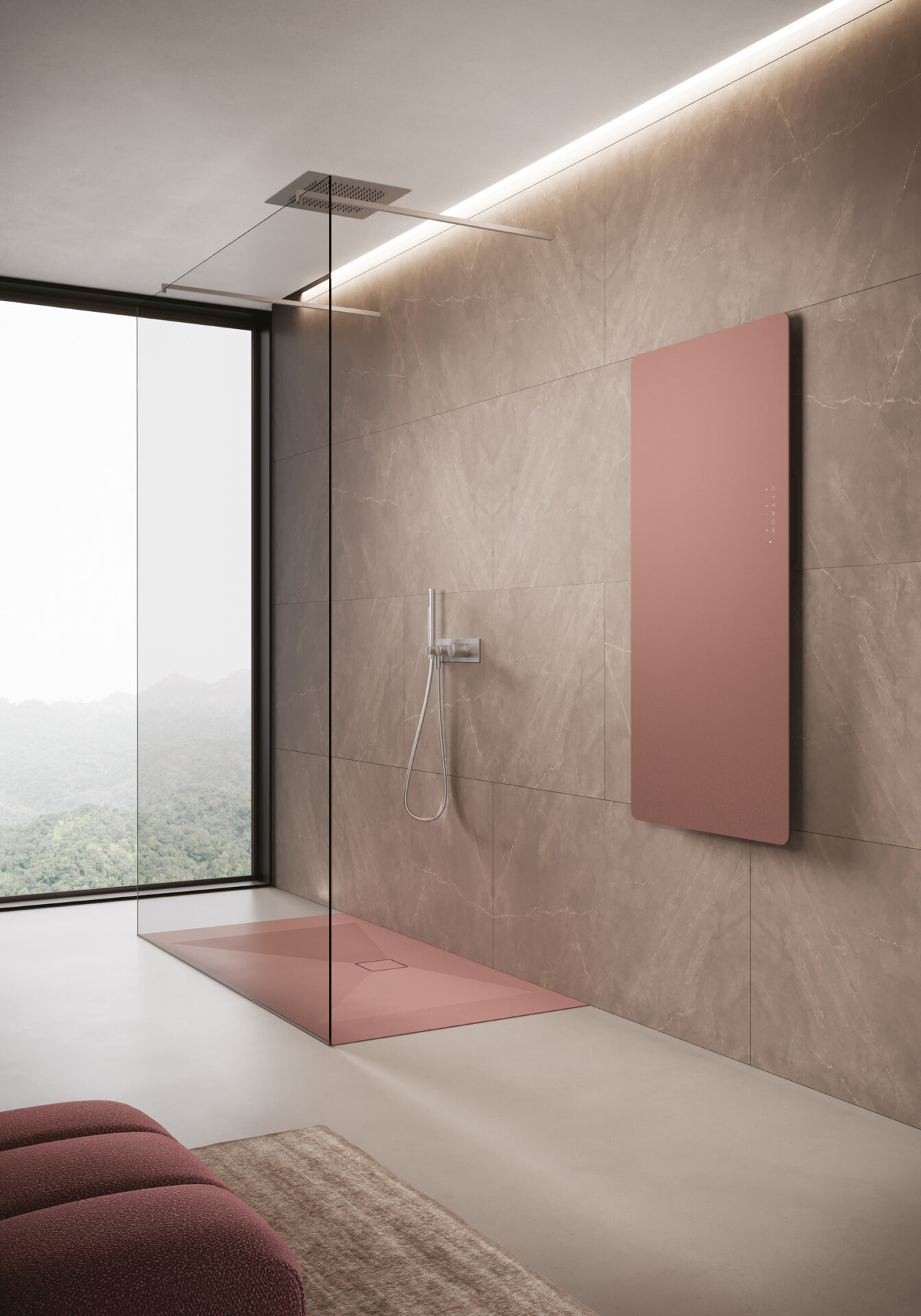 To complement the bathroom décor, the Helios electric radiator comes in a variety of colours and materials, including Aquagel and Aquatek Light, frosted glass (Bianco, Nero, coloured or in a Metal Color), and in a mirror finish. It is also available in a choice of Laminam Stoneware options to match the Blade shower tray, wall cladding and vanity tops with integrated washbasin, or cabinet fronts from the Dogma collection in the same material. It also comes in Tecnogel in a range of colours, with the same textured finish as the Nolita shower tray (warp and weft effect), or with the same finish as the Piano, Dual, Luna, Krus and Catino shower trays.