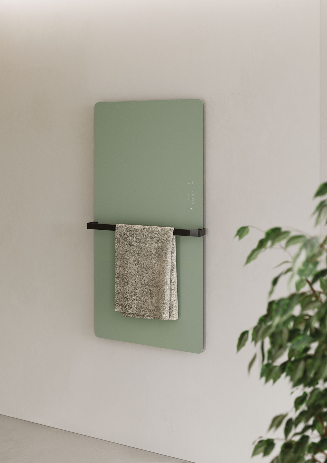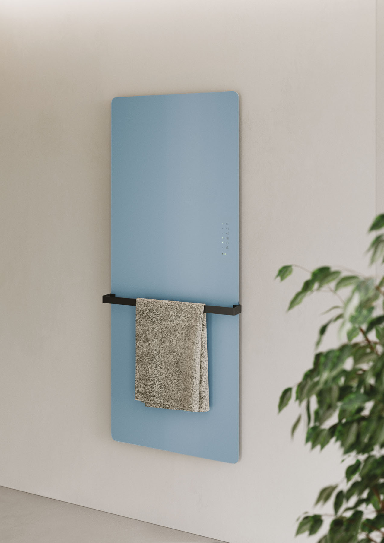 The towel rail can be lacquered to match the electric radiator, or finished in black.