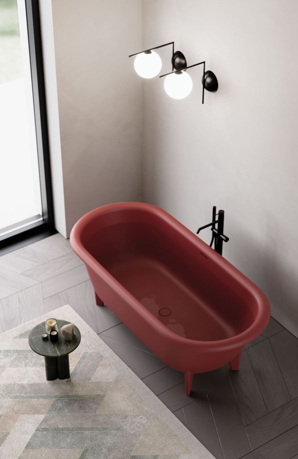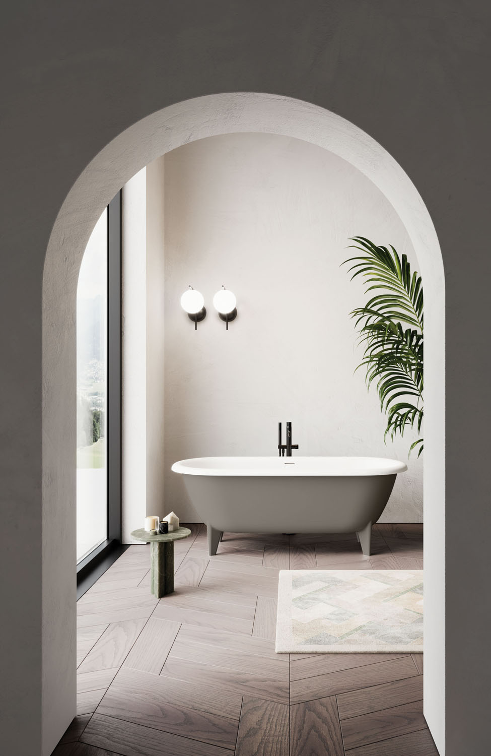 The Rialto bathtub is a sanctuary of well-being defined by timeless design and a sophisticated atmosphere. It is crafted from matt Bianco Cristalplant, with the option of a matt lacquered finish (exterior only or full) in any colour in the Ideagroup, RAL and NCS palettes. Complete with integral overflow. Pop-up waste available. Colour matching waste cover.