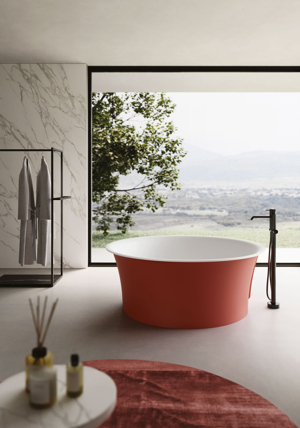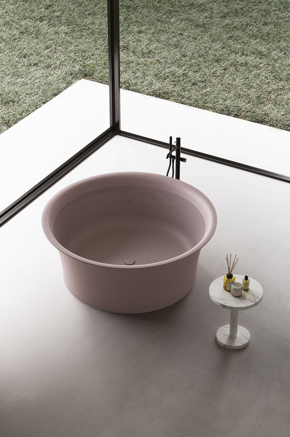 Ring: the circular design of the Ring bathtub creates a serene, calming atmosphere. Made of Aquatek Light, with the option of a matt lacquered finish (exterior only or full) in any colour in the Ideagroup, RAL and NCS palettes. Complete with integral overflow. Pop-up waste available. Colour matching waste cover. Free-standing and sunken versions available.