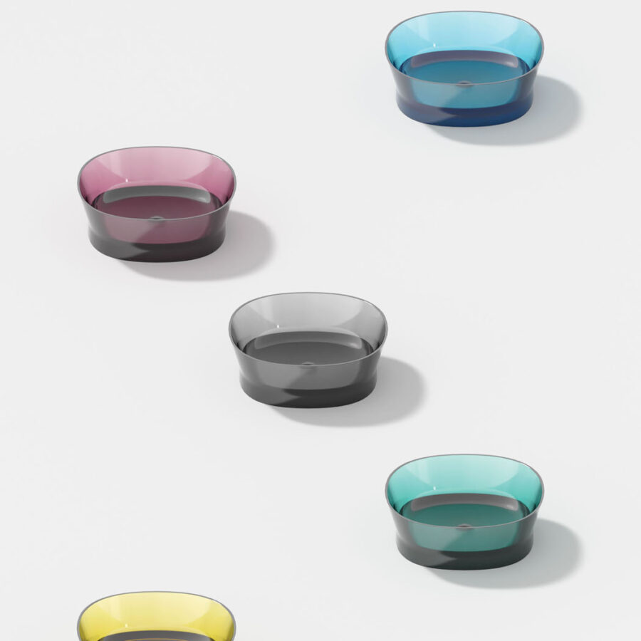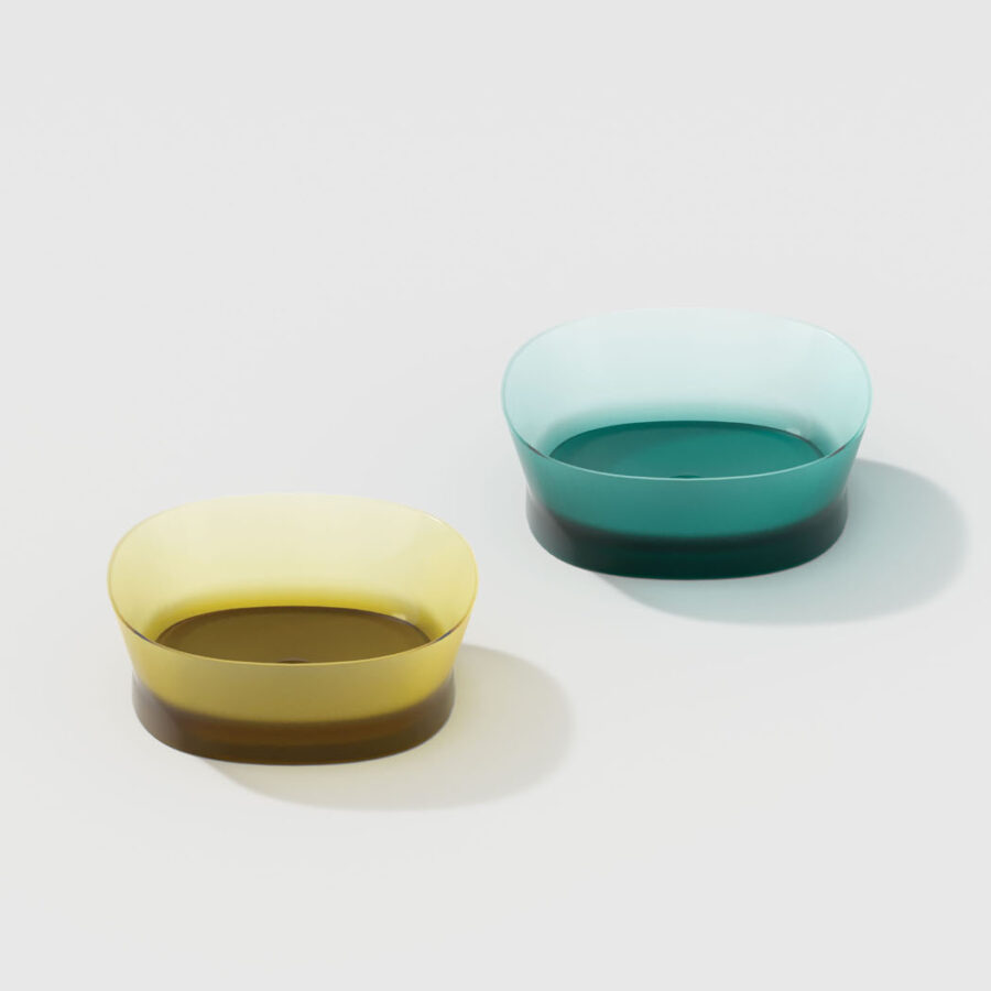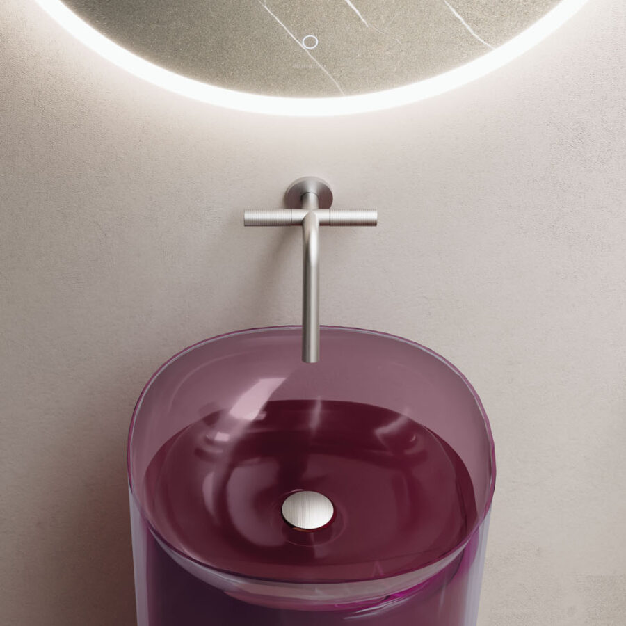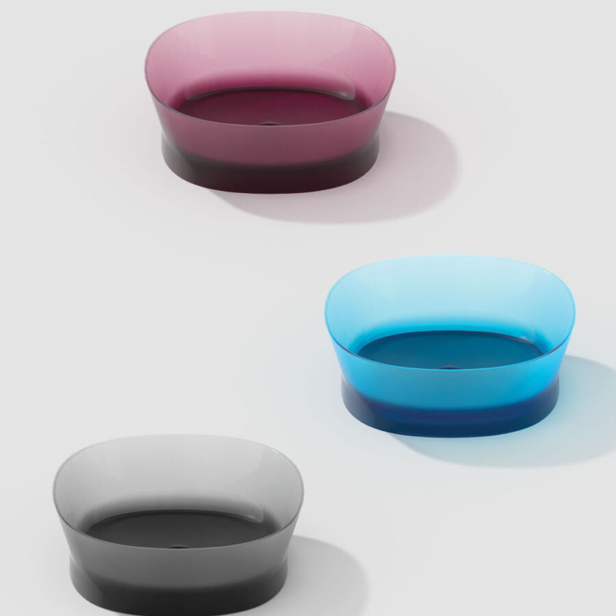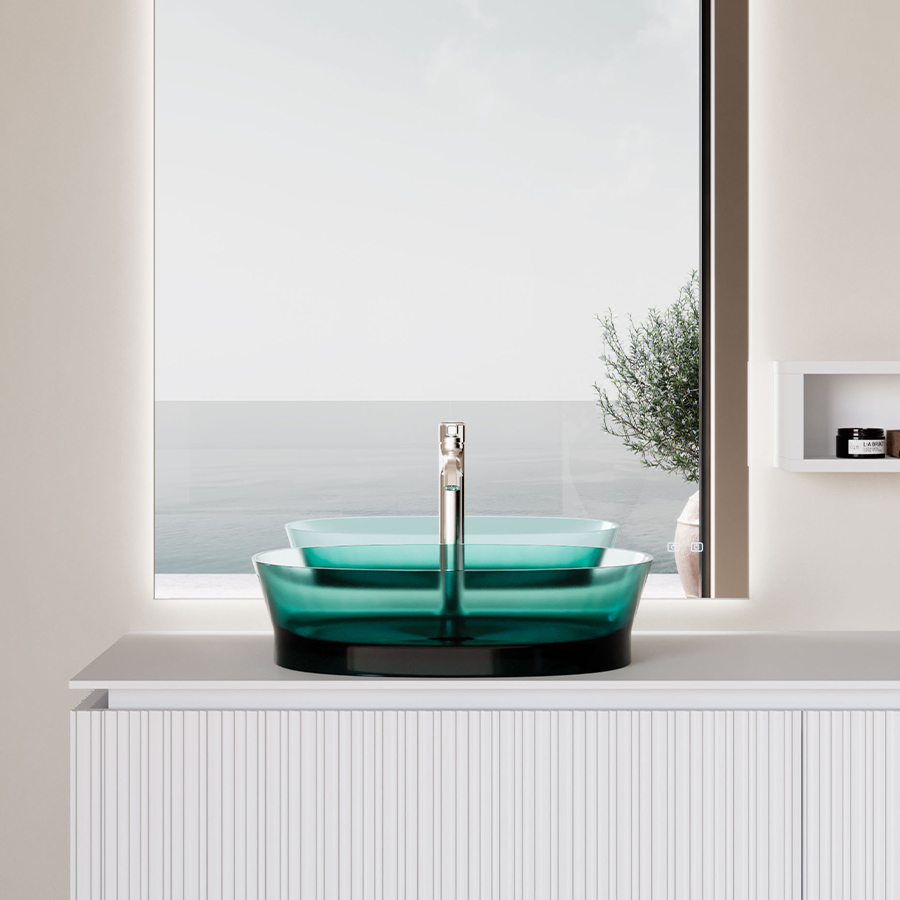 Discover our innovative bathroom collection made of Khromalite, an innovative material that combines transparent surfaces with exceptional colour depth. The collection includes a bathtub in two sizes (L 158 x W 77 x H 59cm and L 173 x W 84.5 x H 59.5cm), a square washbasin, a rectangular washbasin, and a free-standing washbasin. Khromalite is an innovative, high-quality polyester resin containing colouring pigments. It is known for its exceptional durability, versatility, and luxurious feel.